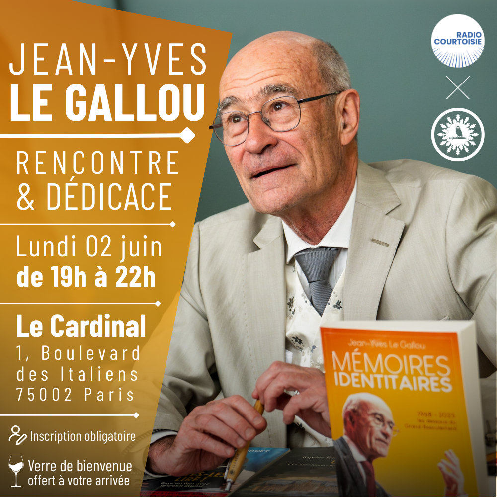 📚 Afin de fêter la publication de ses Mémoires identitaires qu’il aura le plaisir de vous dédicacer, Jean-Yves Le Gallou réunit ses lecteurs, ses compagnons de route et ses partenaires pour une soirée conviviale au cœur de Paris.