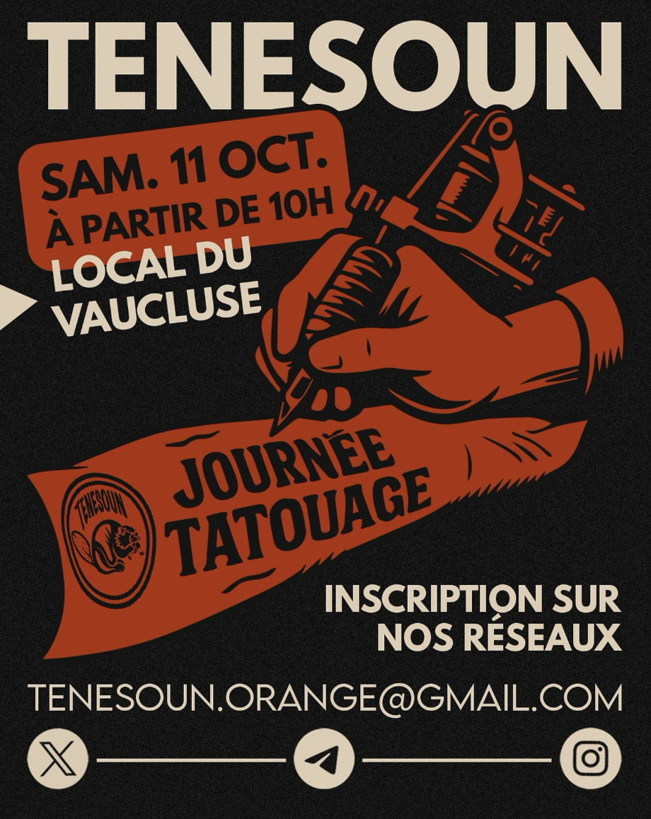 🏛️ L'antenne Vaucluse de Tenesoun vous convie ce samedi 11 octobre à une journée tatouage : restauration, buvette, bonne ambiance et flashs.