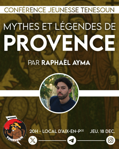 👉🏻 Nous vous donnons rendez-vous jeudi prochain pour une conférence à notre local d'Aix-en-Provence portant sur les mythes et les légendes de Provence. Nous étudierons la mystique et le folklore de notre région dans une ambiance conviviale et politique.