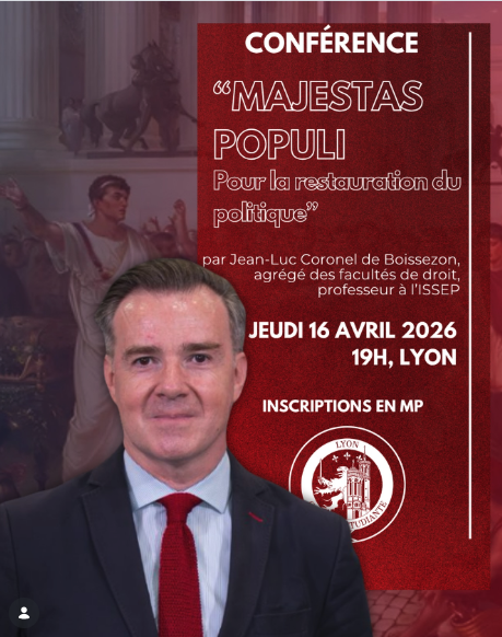 Nous aurons l’honneur de recevoir @jean.luc_coronel.de.boissezon, agrégé des facultés de droit et professeur à l’ISSEP pour une conférence intitulée « MAJESTAS POPULI. Pour la restauration du politique. »