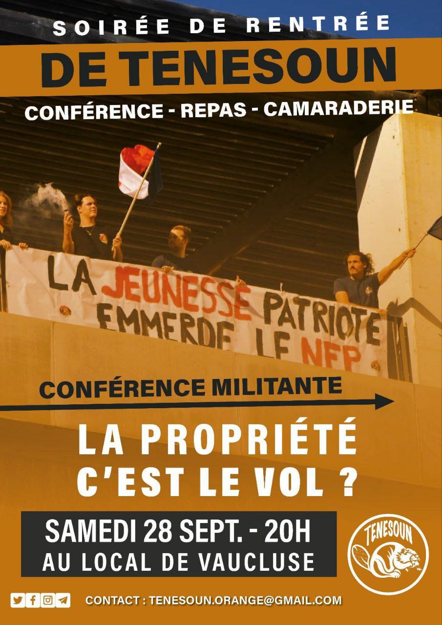 Soirée de rentrée de la section Vaucluse de Tenesoun dès 17hConférence sur la propriété privée à 20hRepas et boissons sur place